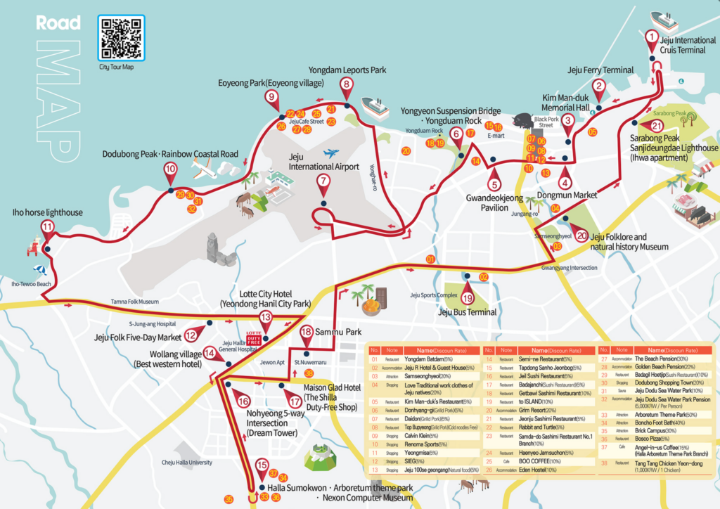 • 🚎A flexible hop-on, hop-off double-decker bus that loops around major attractions in Jeju City