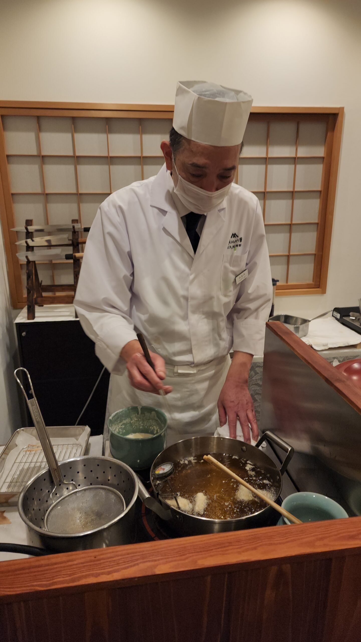 Despite the language barrier, the chef kindly explained each dish using his phone to translate. Eventually, the big boss (maybe the owner?) came out to cook and chat with us in English. They were so welcoming and even encouraged us to take videos while they freshly fried our tempura!